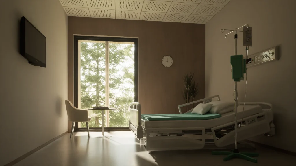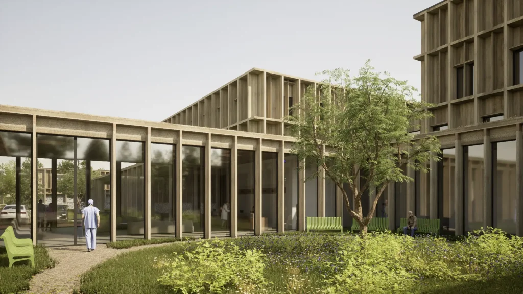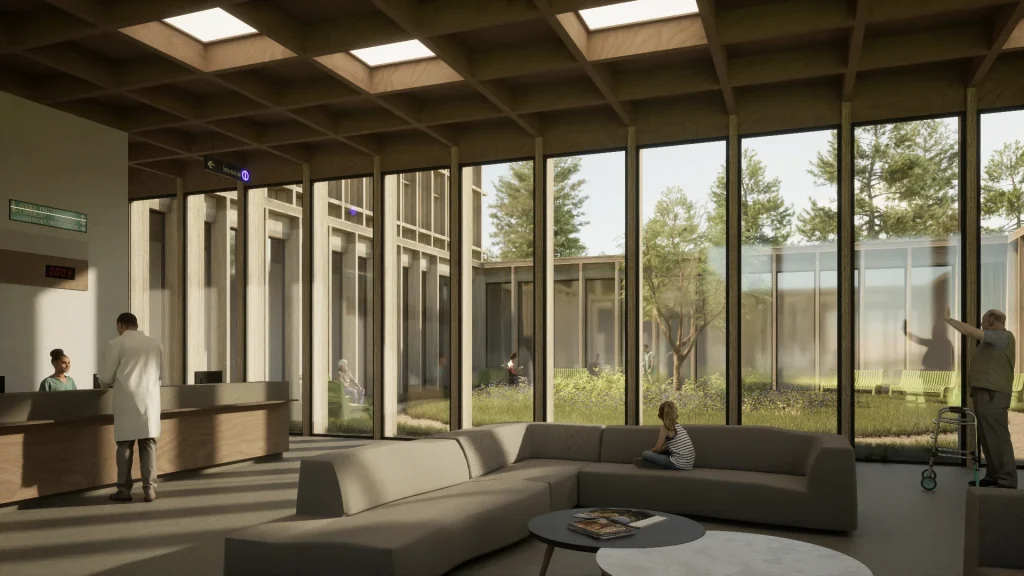 The proposal for the general hospital in Pljevlja, Montenegro, takes a human-scale approach, connecting the city and surrounding mountains. It features small pavilion-like volumes arranged like stepping stones, following the natural slope. The design reflects the patient’s care journey, from arrival to recovery. The hospital prioritizes creating a healing environment that integrates with nature. Large courtyards bring light and fresh air to spaces typically lacking in hospitals and create a serene atmosphere resembling a walk in the woods. The hospital is nestled within a park-like setting, preserving existing trees and providing public spaces and paths. The architecture blends harmoniously with the environment, using wood and local stone materials.