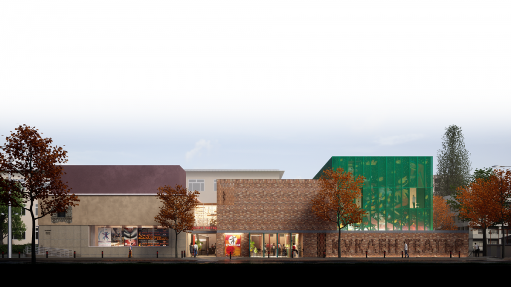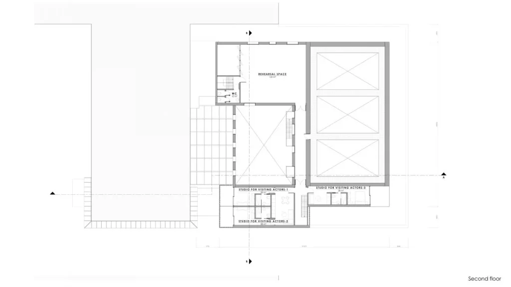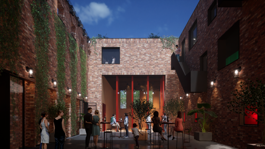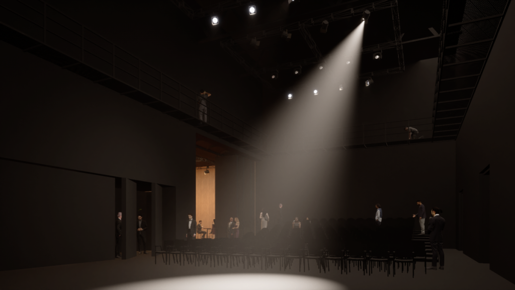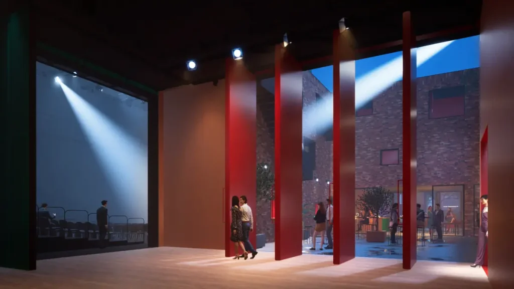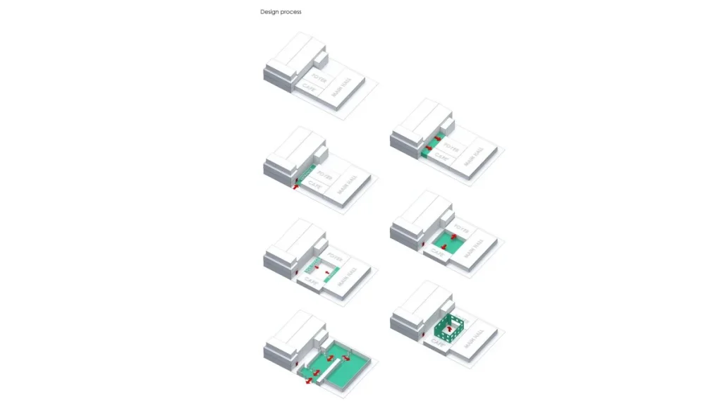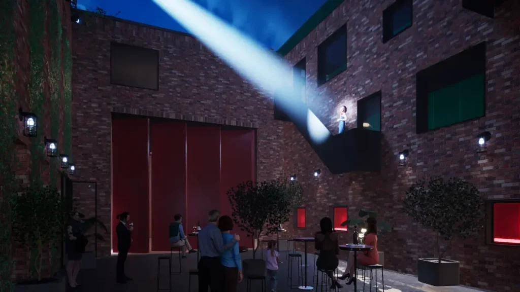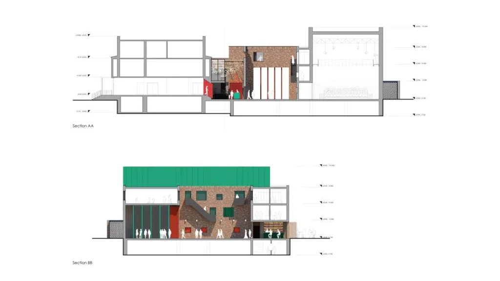 The project aims to create a strong connection between the existing theater and a new building, utilizing a redesigned entrance that evokes the essence of a back alley. This entrance, enhanced with inviting lighting and signage, leads visitors to a central courtyard, a versatile space for gatherings, performances, and screenings. A striking glass ceiling adorned with wooden elements mimics puppetry crosses, adding theatricality through dynamic light and shadow play. The vibrant red passage to the existing foyer establishes continuity between the two buildings, enhancing their visual relationship.